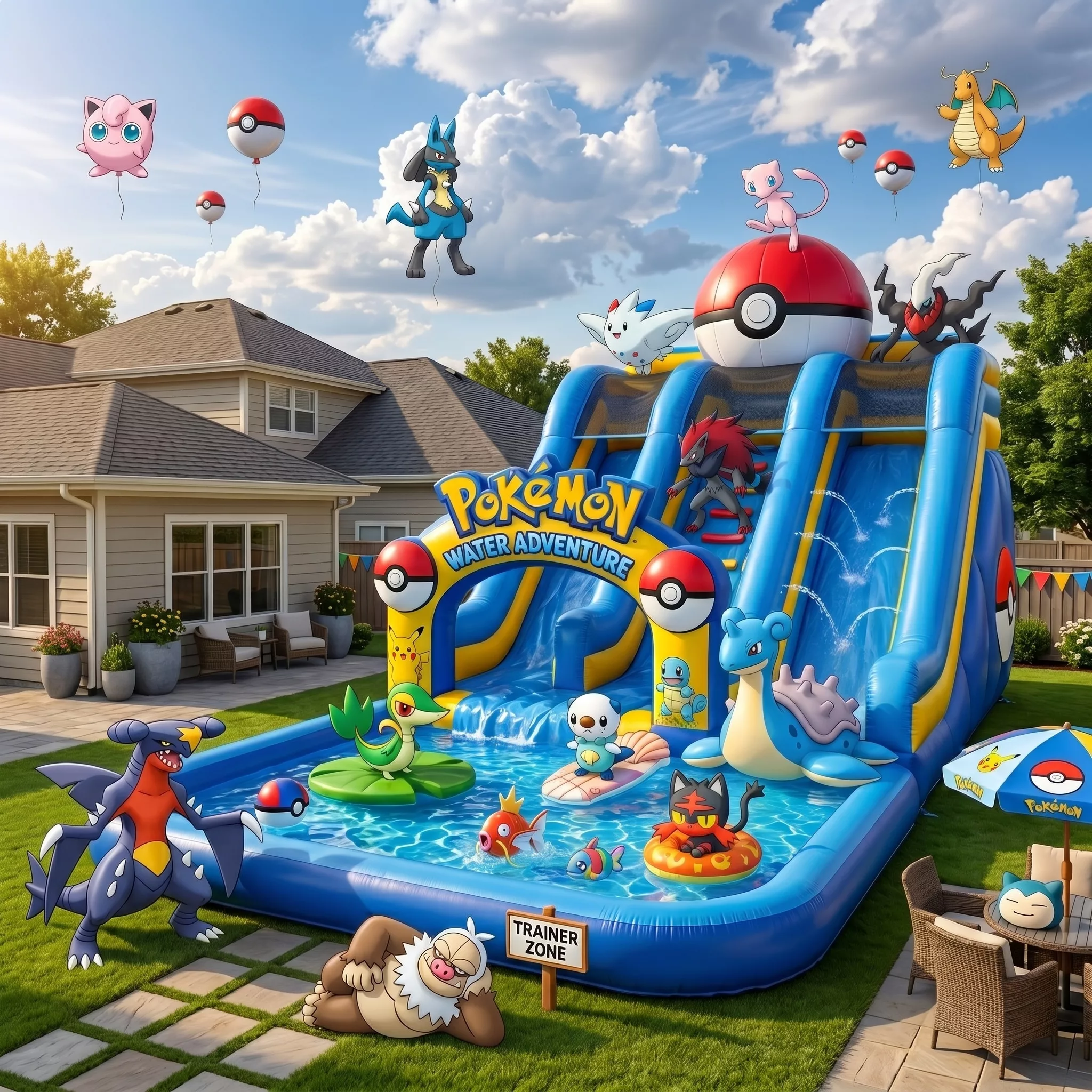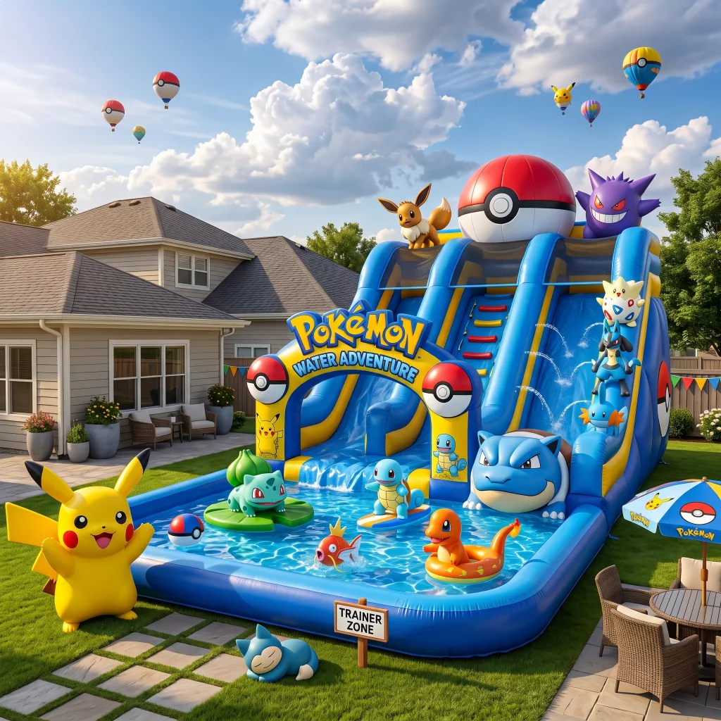 Incorporate Pokémon-themed towels, floats, and toys to complete the setup.